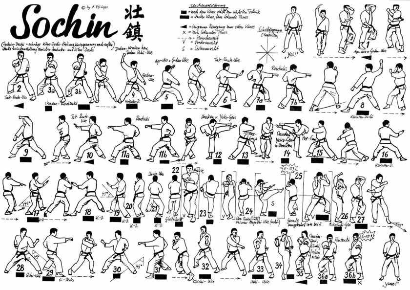 Sochin es un kata muy complejo, con giros, diversos cambios de velocidad y movimientos corporales únicos, todo esto añadido a su complejidad. Aparte de las técnicas avanzadas del Kihon, no es muy difícil o avanzado.